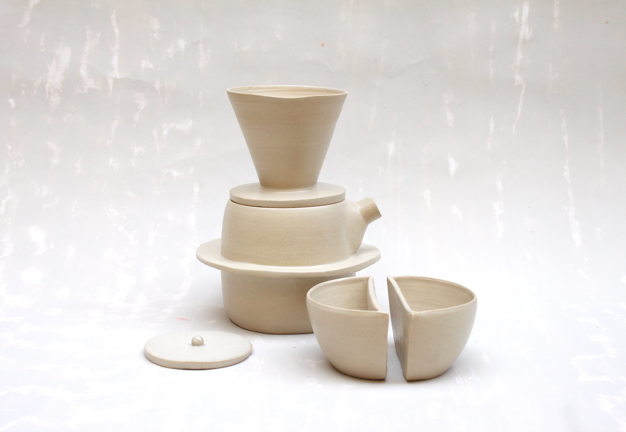 La teiera e le due tazze nascono come pezzo unico al tornio che poi viene diviso e rielaborato a mano; la forma delle due tazze riprende la forma dei due chicchi che nascono all’interno della drupa.